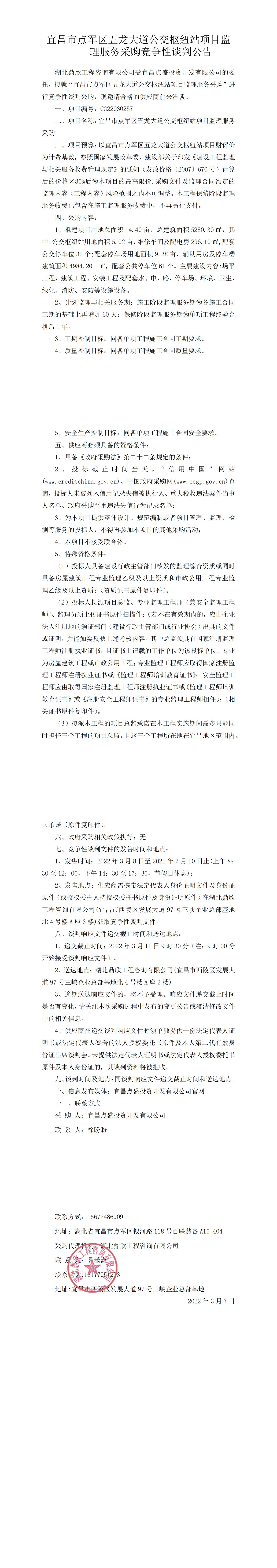 宜昌市點(diǎn)軍區(qū)五龍大道公交樞紐站項(xiàng)目監(jiān)理服務(wù)采購競爭性談判公告
