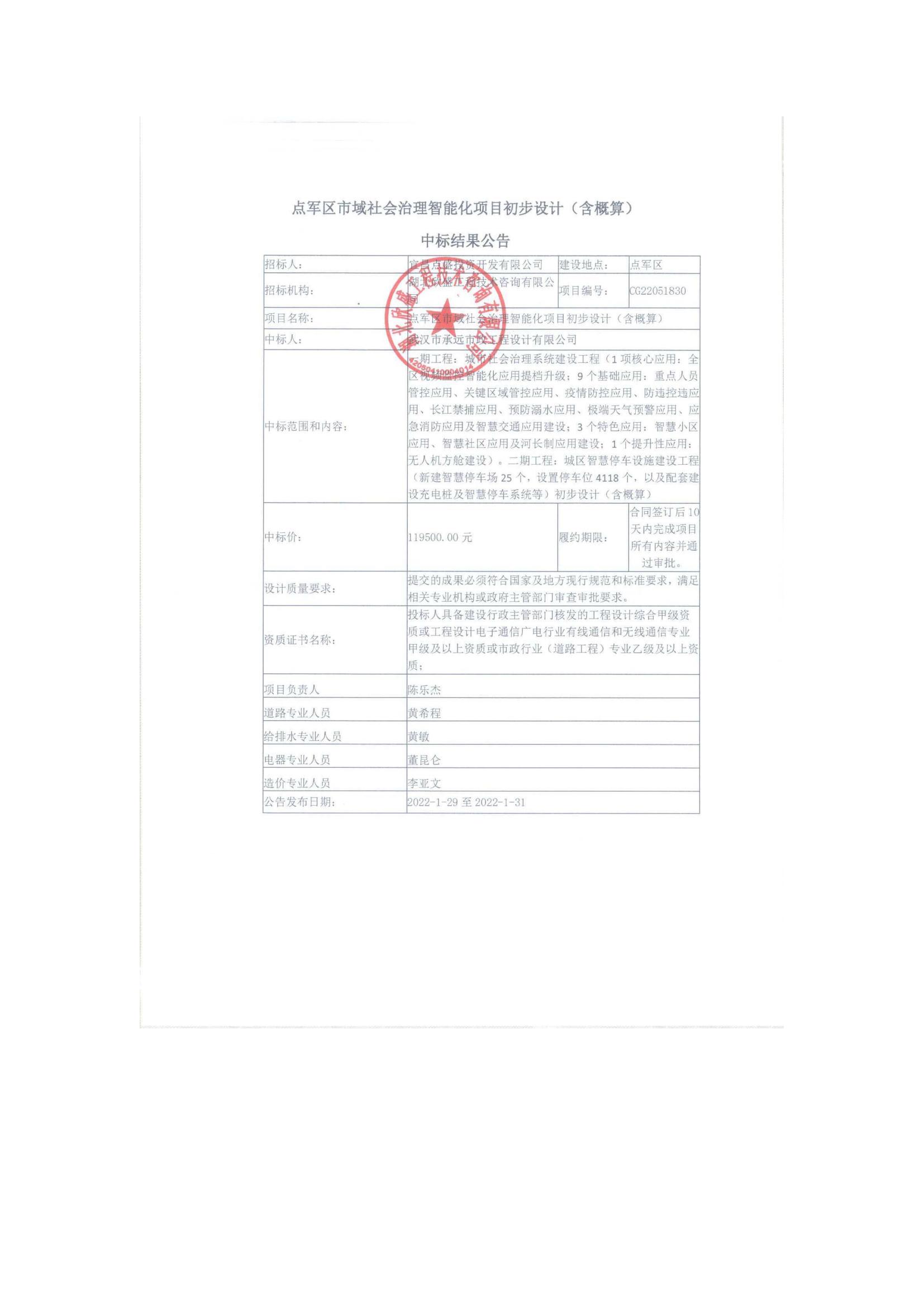 點軍區(qū)市域社會治理智能化項目初步設(shè)計(含概算)中標結(jié)果公告