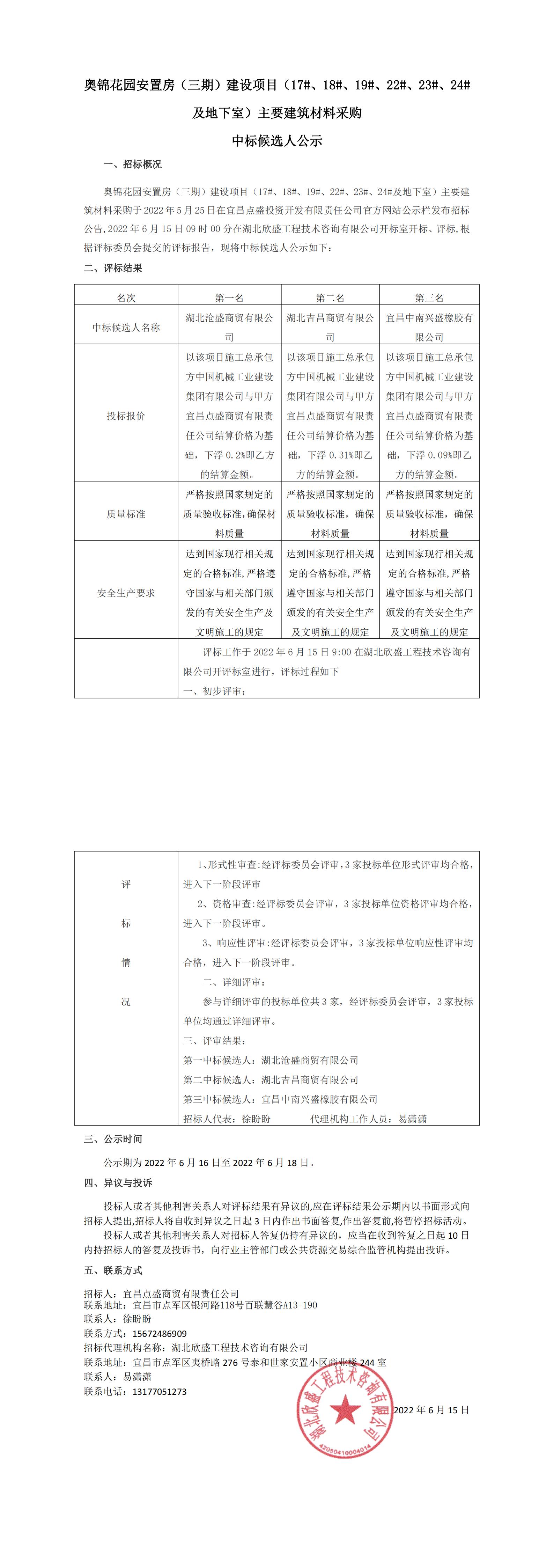 奧錦花園安置房(三期)建設項目(17#、18#、19#、22#、23#、24#及地下室)主要建筑材料采購中標候選人公示